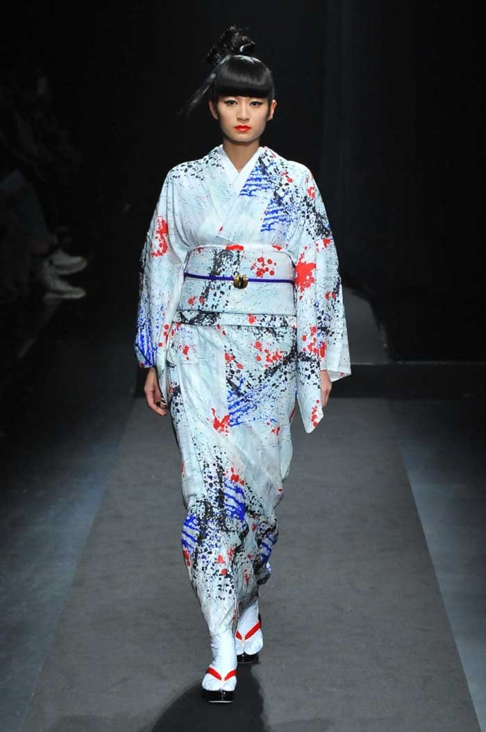“When I played, I focused on the kimono as having the main role,” he said, his blonde hair falling in soft waves around his face, lips accentuated in,pink lipstick. It was the musician’s second kimono airing at Japan Fashion Week following his debut last October, also showcasing body-hugging kimonos, also slashed to miniskirt-length and worn with stilettos.