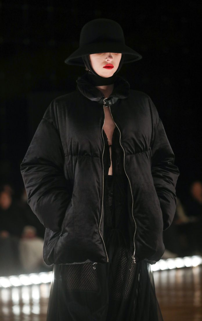 FETICO also introduced several new silhouettes and accessories this season, including the brand’s first trench coat, long boots with belted detailing, and cross-strap pumps. Accessories were rich with 1950s influence, from two-way lamb leather gloves and leather harnesses to scarf-accented hats, garter-patterned fishnet tights, and freshwater pearl necklaces.