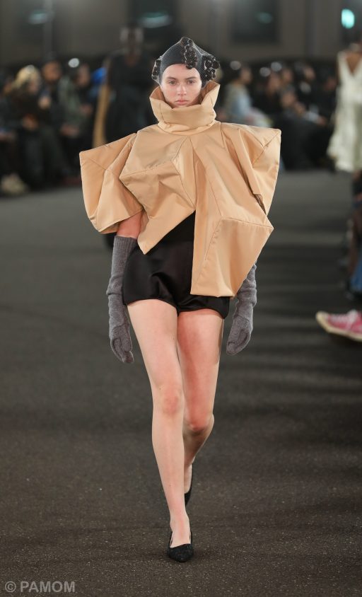 Materials played a central role in underlining these ideas. The lineup included matte textures that invoked natural surfaces, along with felt and melton fabrics that contributed to three‑dimensional silhouettes. Colors remained measured, primarily grounded in neutral tones with occasional accents to introduce contrast.